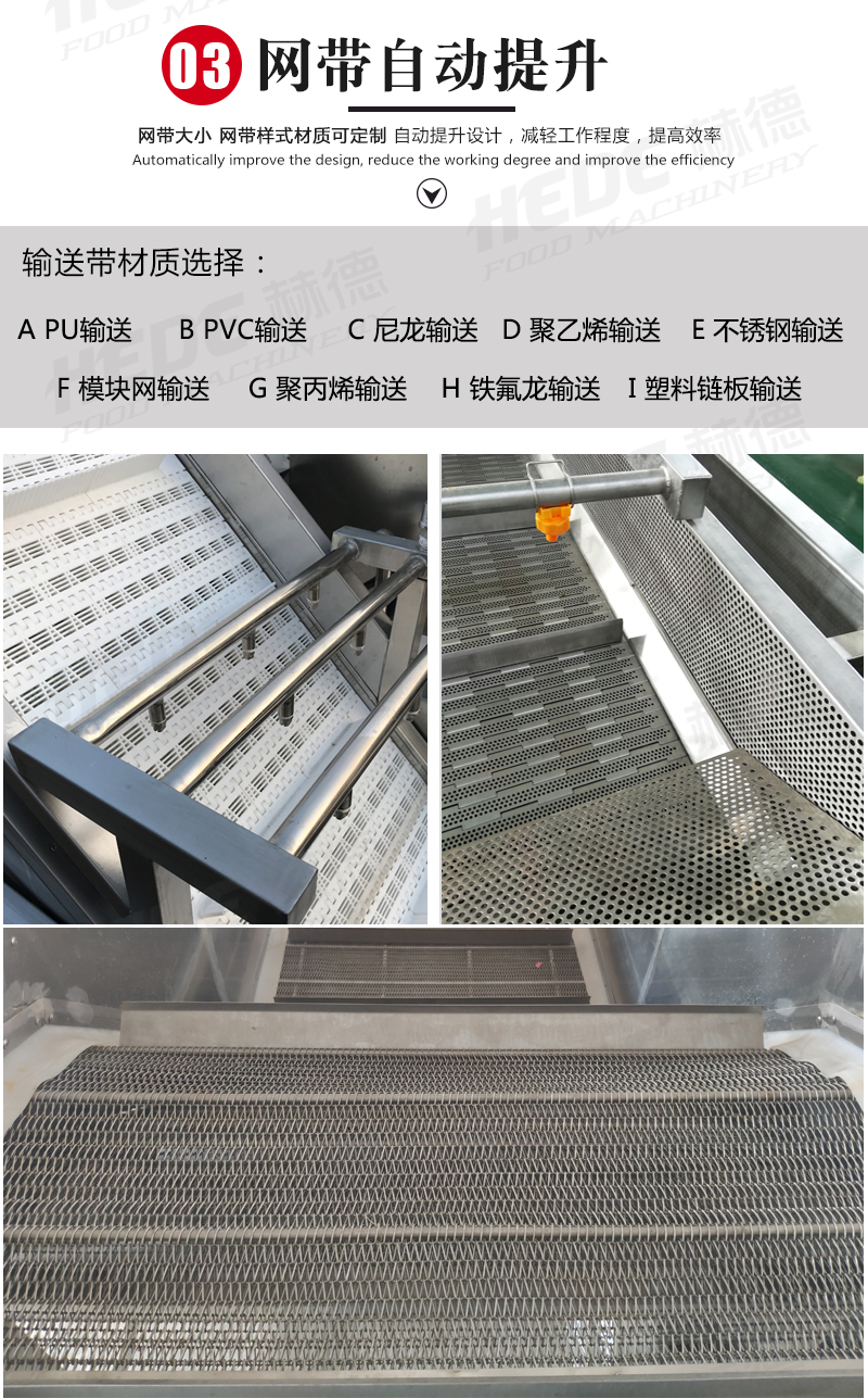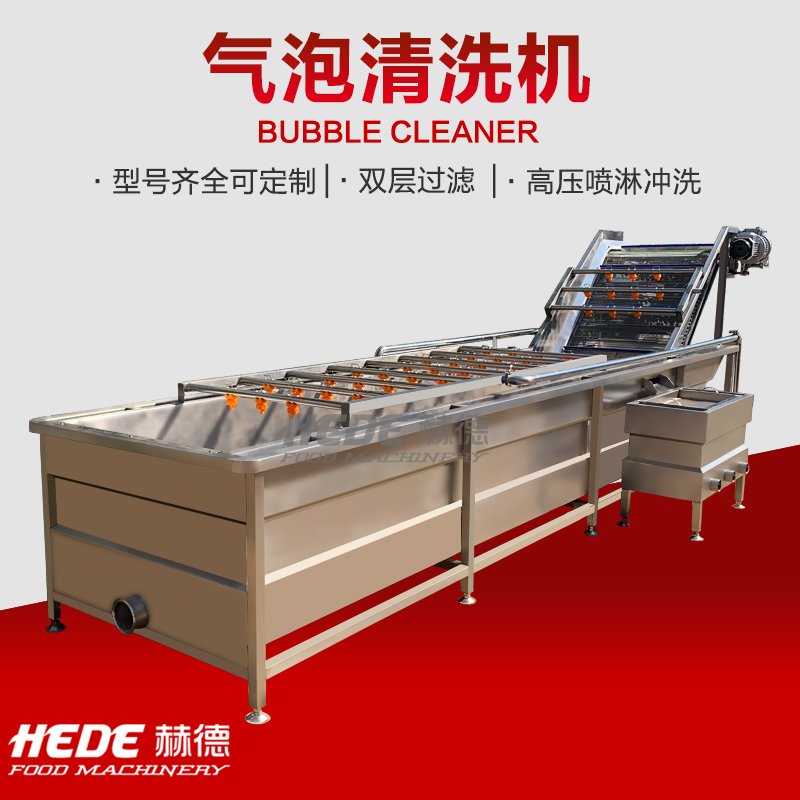 这是一款气泡清洗设备,主要用于果蔬、中药材、水产等物料的清洗环节,设备主体采用食品级不锈钢制作,适合在食品加工环境下使用,清洗过程中设备通过风机产生气泡在水中形成翻腾效果,使物料在水流中浮动并相互分离,同时配合喷淋水的冲刷,有助于物料表面的泥沙、杂质等与物料脱离,气泡的柔和作用可减少对物料表皮的损伤,适用于叶类蔬菜、水果等较为娇嫩的食材,设备的设计注重实用性,可根据物料特性和产量需求调节气泡强度与清洗时间,清洗槽内的水流方向可控制,便于物料匀速通过清洗区域,实现连续式作业,该设备可代替部分人工清洗工作,适用于净菜加工、中央厨房、农产品配送等场景的日常生产。