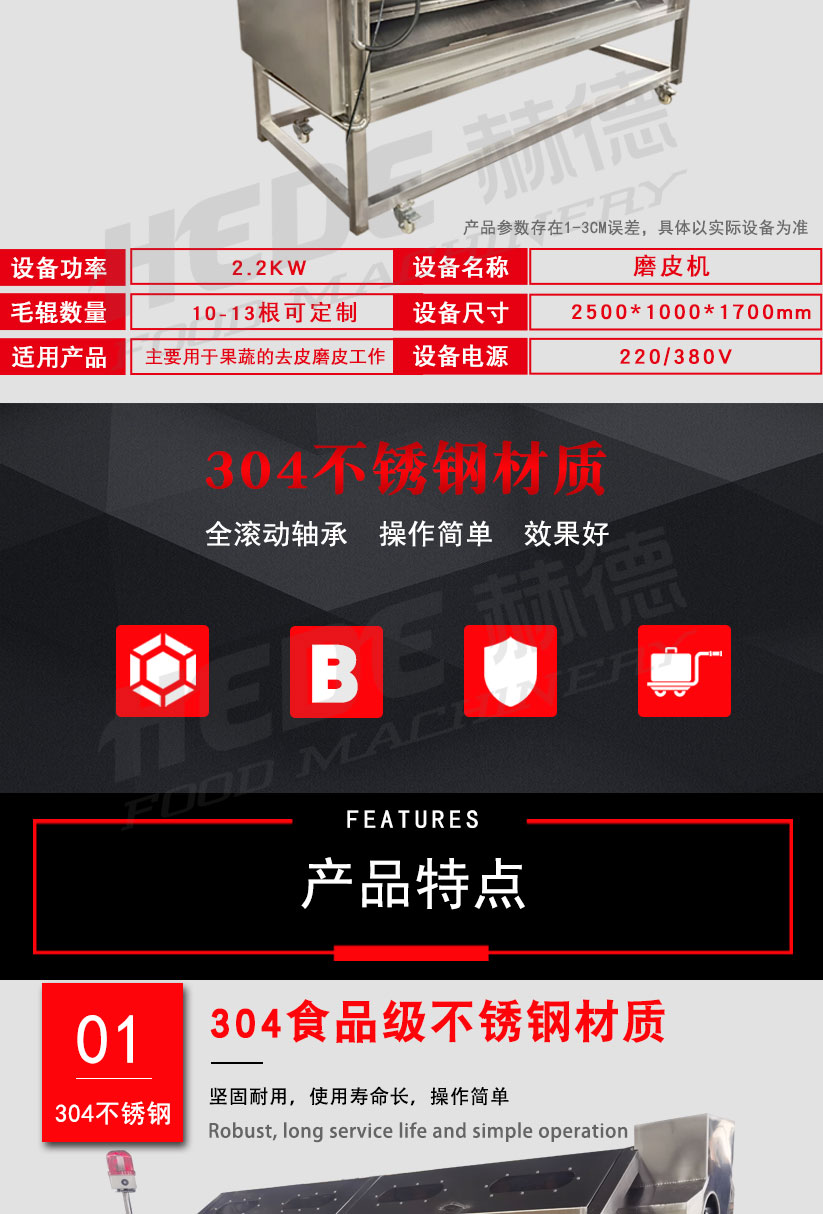 这是一款专为食品加工设计的磨皮机,主要用于根茎类蔬菜(如土豆、胡萝卜、芋头)的去皮处理。设备适用于中央厨房、净菜加工厂、酱菜厂等场所。 本机采用金刚砂磨辊或砂盘作为磨削部件,通过旋转摩擦的方式去除食材表皮。干法磨皮和湿法磨皮两种机型可选,你可以根据实际工艺需求选择合适的配置。 操作上设计了简单的控制方式,通常支持连续或批量投料。接触食材的部分采用食品级不锈钢材质,具备一定的防锈耐腐蚀能力,清洗比较方便。整机结构紧凑,适合长时间连续使用的加工场景。