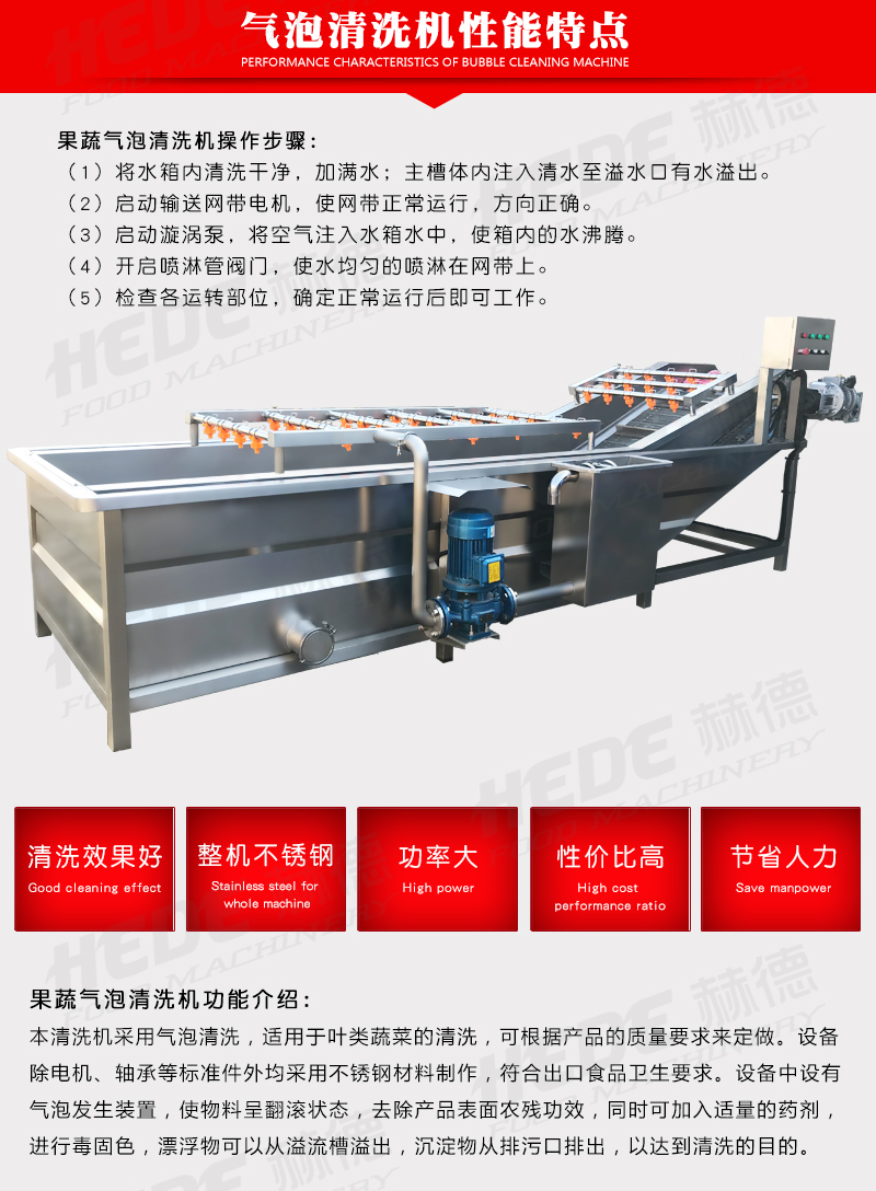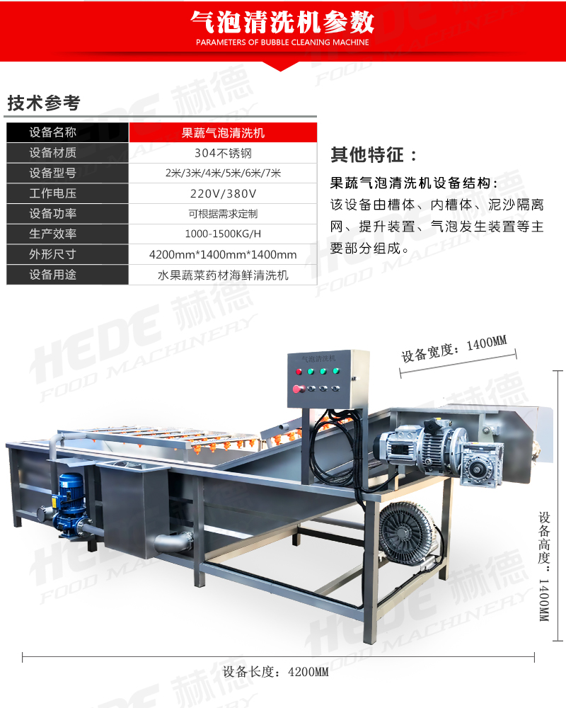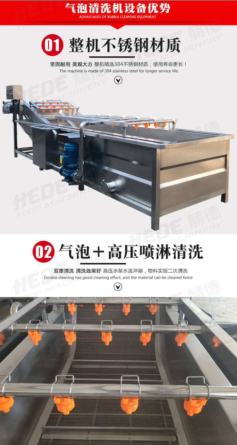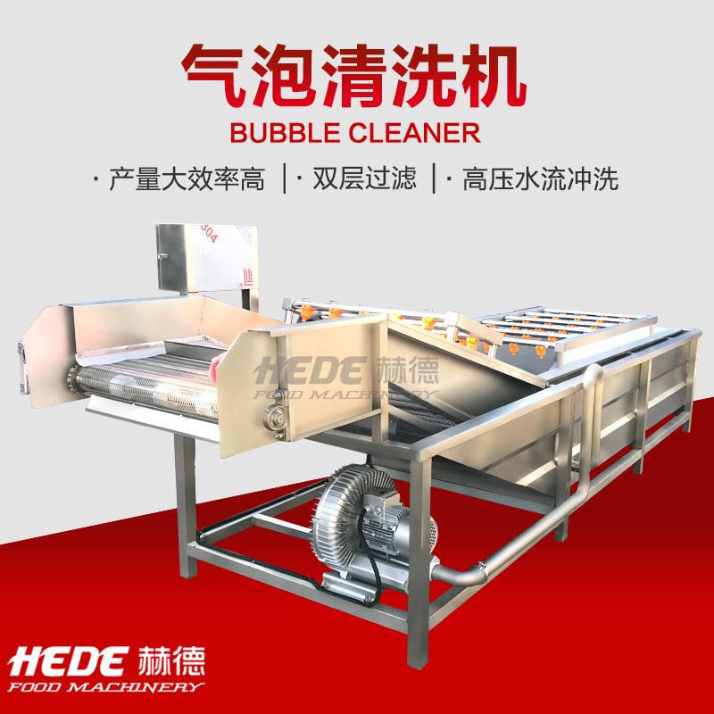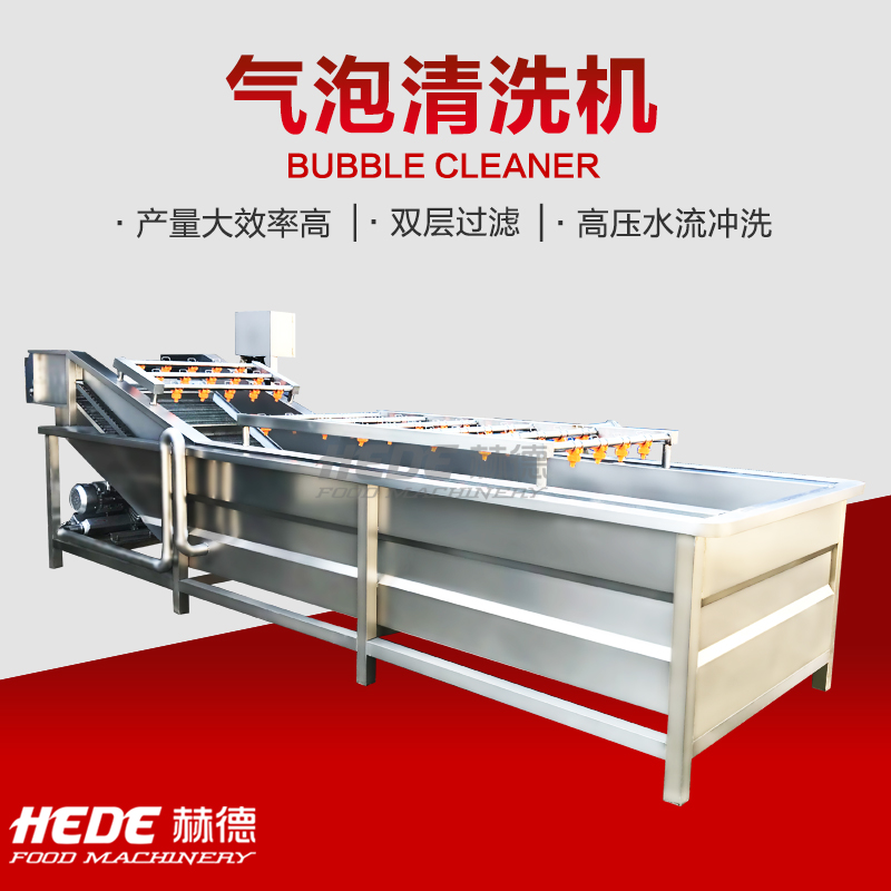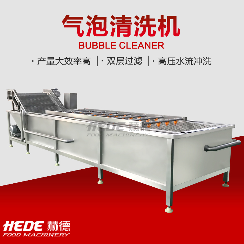 这是一款气泡清洗设备,主要用于果蔬、中药材、水产等物料的清洗环节,设备主体采用食品级不锈钢制作,适合在食品加工环境下使用,清洗过程中设备通过风机产生气泡在水中形成翻腾效果,使物料在水流中浮动并相互分离,同时配合喷淋水的冲刷,有助于物料表面的泥沙、杂质等与物料脱离,气泡的柔和作用可减少对物料表皮的损伤,适用于叶类蔬菜、水果等较为娇嫩的食材,设备的设计注重实用性,可根据物料特性和产量需求调节气泡强度与清洗时间,清洗槽内的水流方向可控制,便于物料匀速通过清洗区域,实现连续式作业,该设备可代替部分人工清洗工作,适用于净菜加工、中央厨房、农产品配送等场景的日常生产。