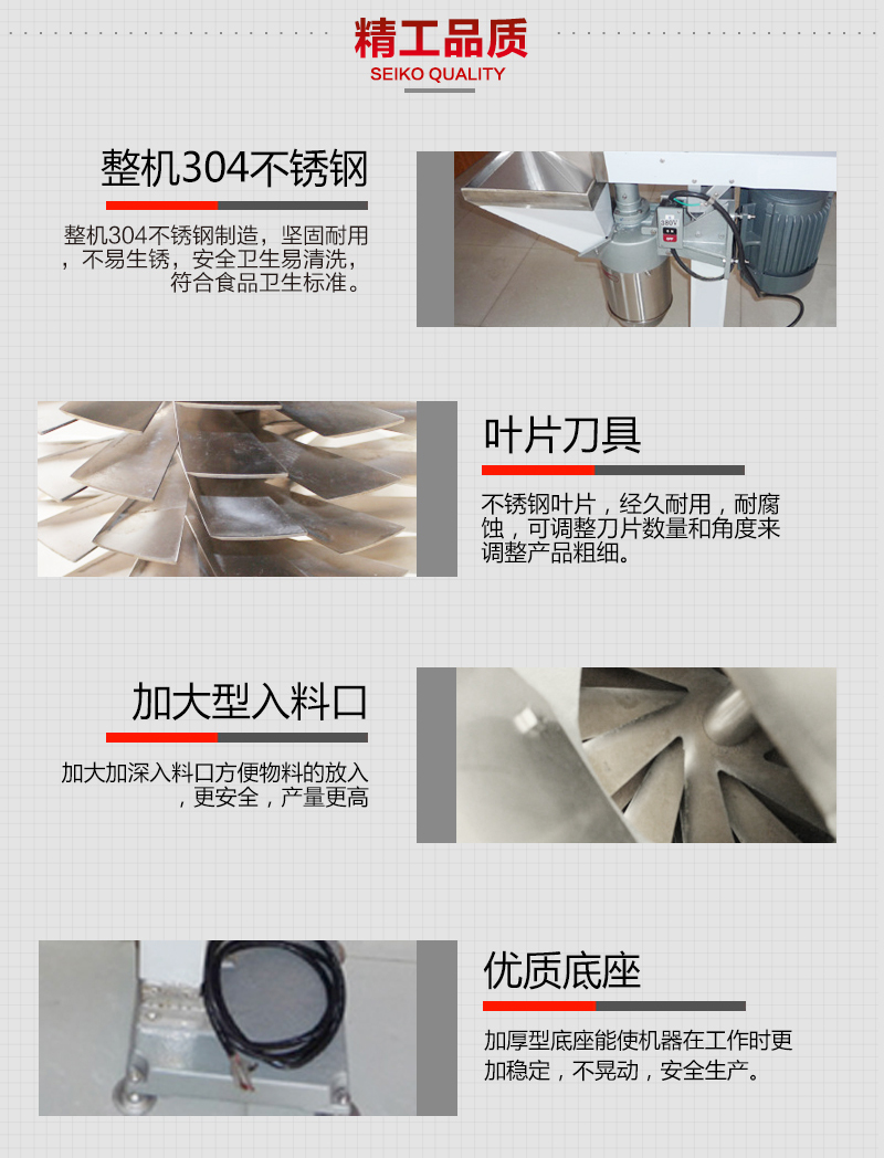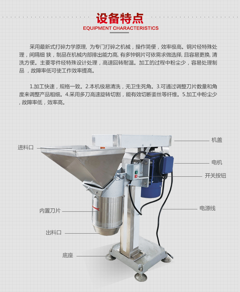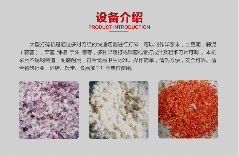 这是一款专为食品加工设计的打碎机,适用于中央厨房、食品厂等场所,用于快速打碎肉类、蔬菜等食材。 设备采用食品级不锈钢机身和钝刀斩切原理,出料粒度相对均匀。操作上配备多档调速与定时功能,满足不同食材的加工需求。 整机结构紧凑,拆卸清洗比较方便。