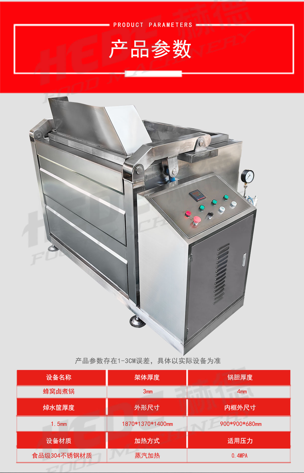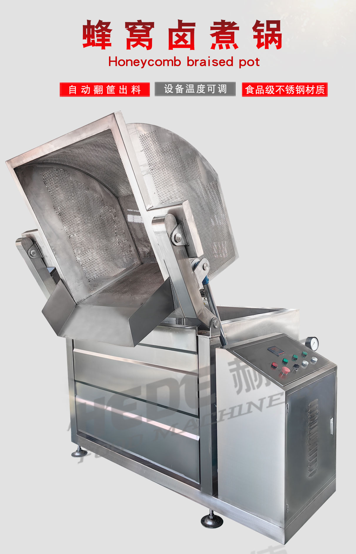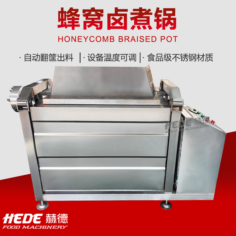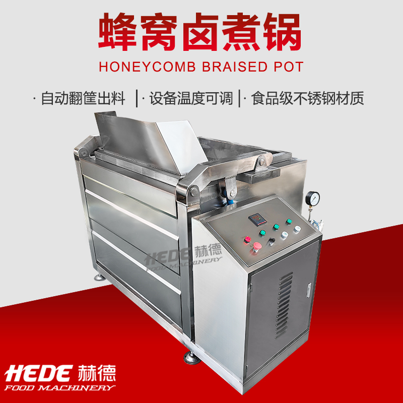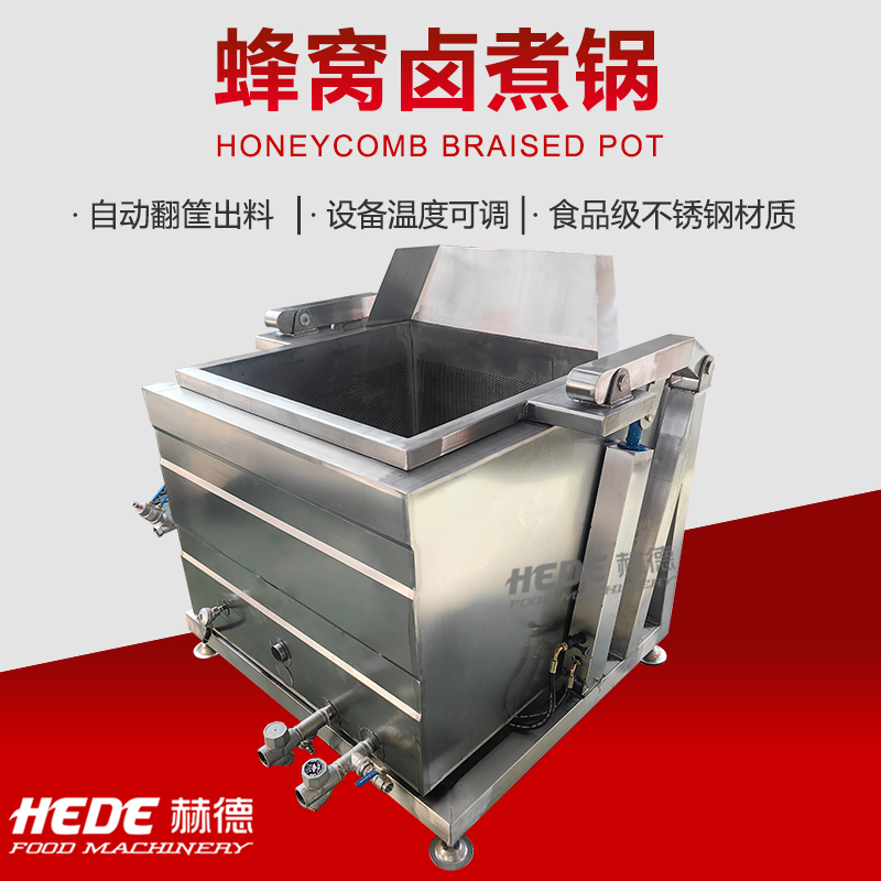 蜂窝卤煮锅是一种食品加工设备,锅体底部采用蜂窝状夹层结构。这种结构扩大了换热面积,使热量分布相对均匀。设备主要用于肉制品、豆制品及根茎类蔬菜的卤制、炖煮加工。物料在卤汁中通过加热完成熟化与入味过程。操作时,可将食材与卤水投入锅内,通过控制系统设定加热温度与时间。设备材质为不锈钢,符合食品加工卫生要求。