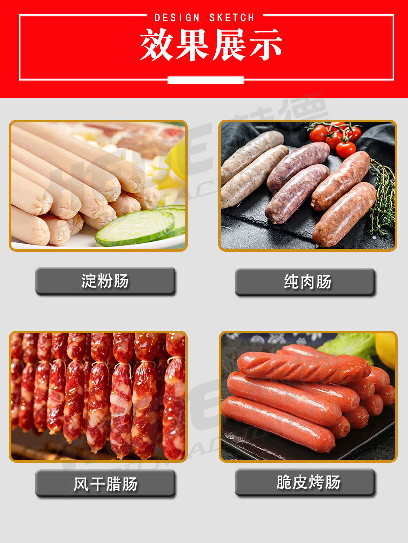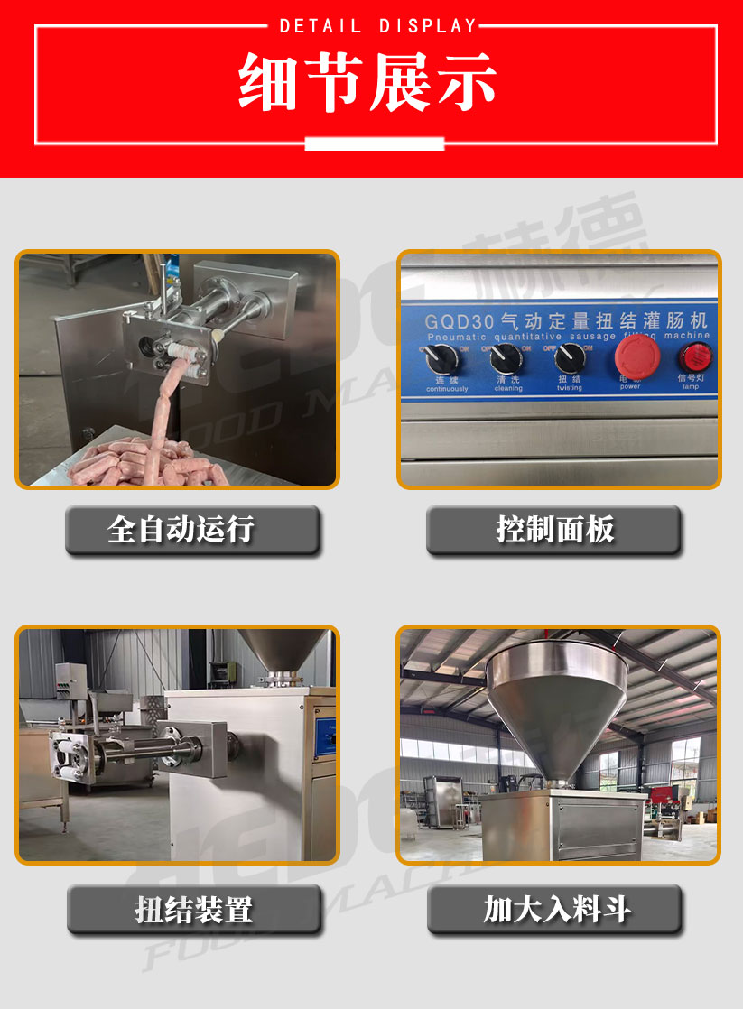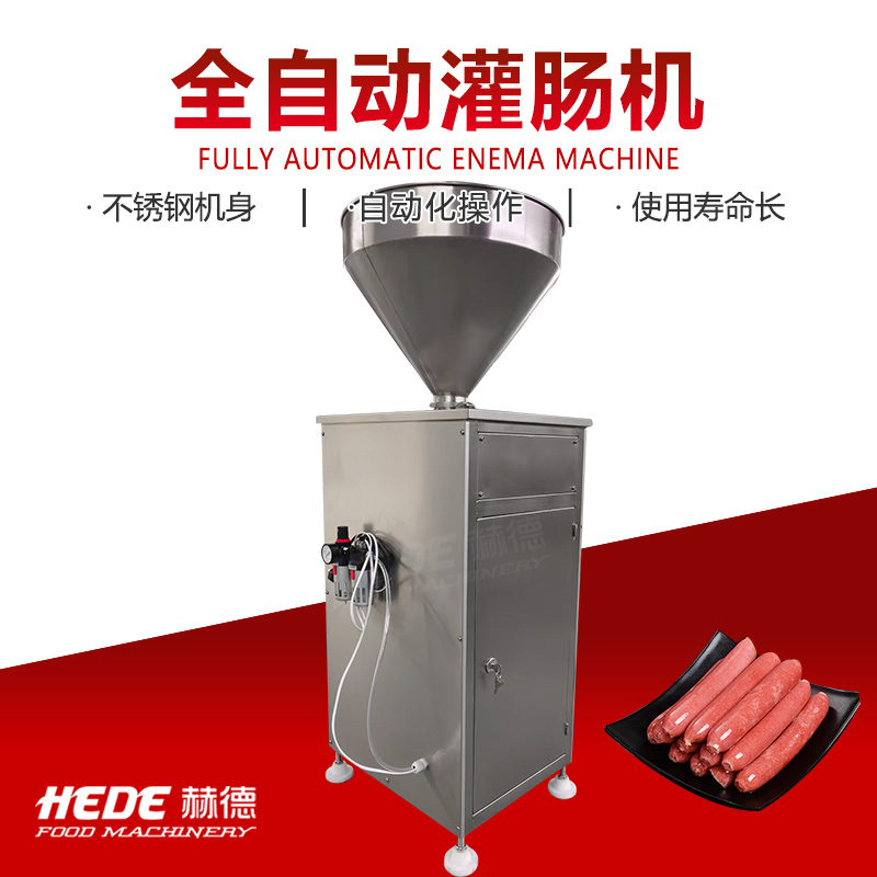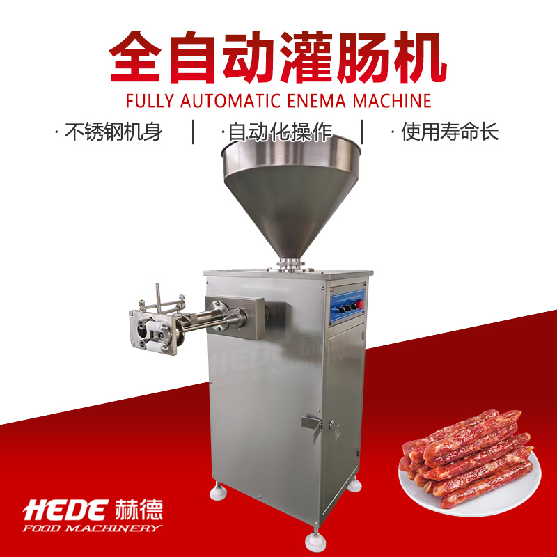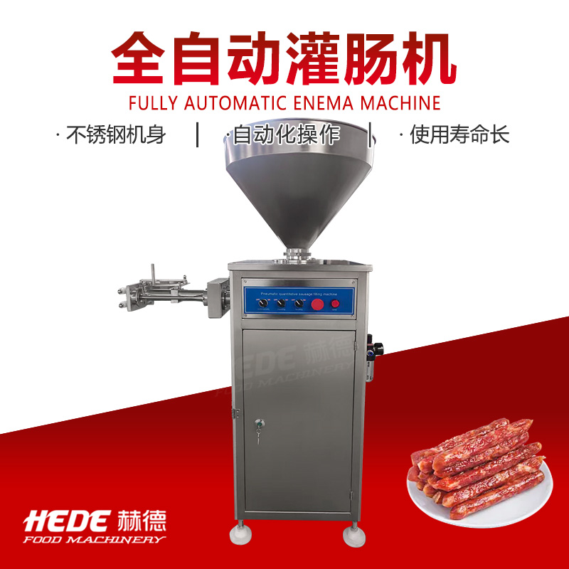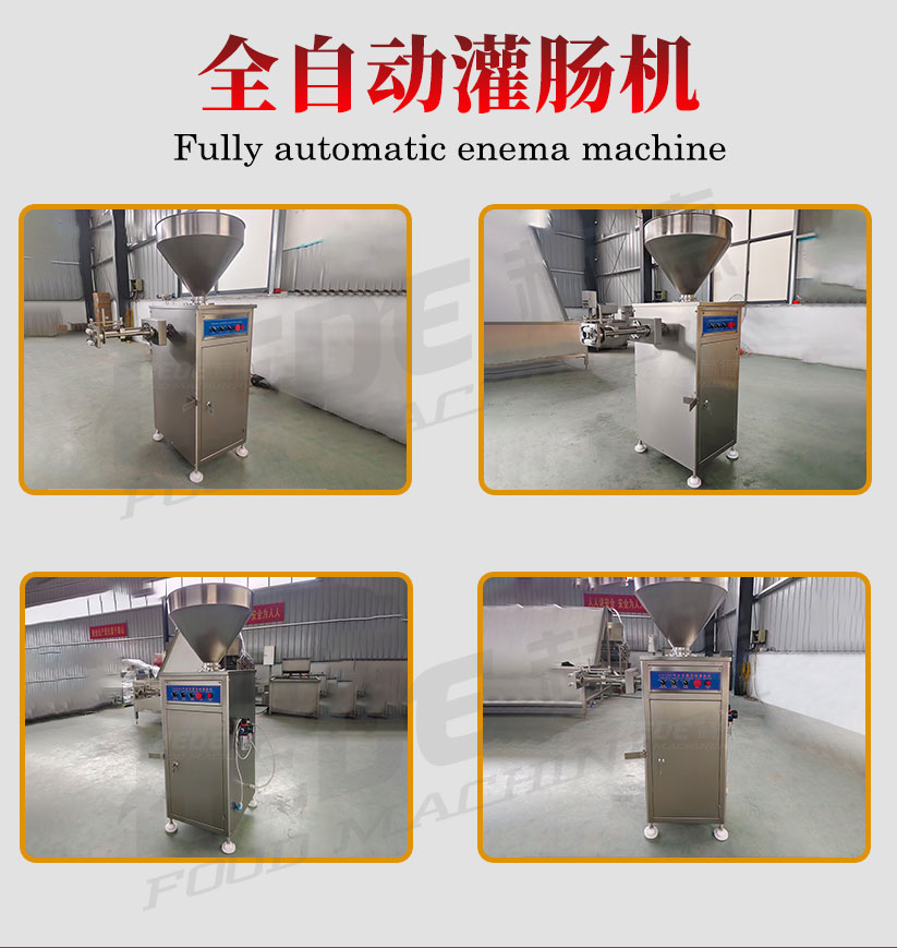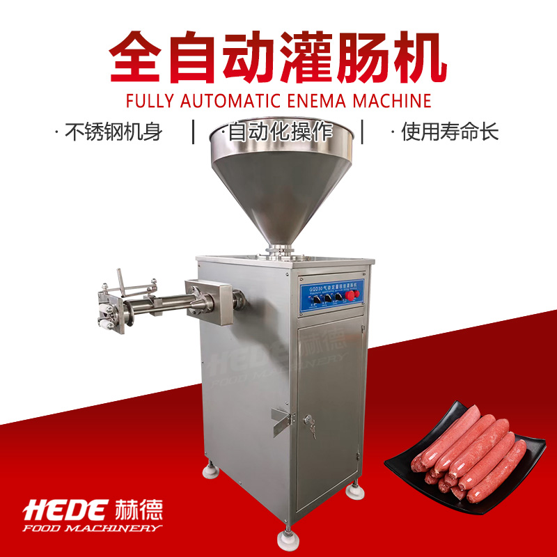 灌肠机是一种用于将肉糜等物料填充入肠衣的食品加工设备。设备主要结构包括料斗、输送泵(或活塞)、灌装管以及控制系统。工作时,物料投入料斗,通过输送机构推入灌装管,再经管口挤出进入肠衣。设备可实现连续或间歇式灌装,灌装速度与单根肠体的重量可根据需要调整。设备材质为不锈钢,与物料接触部分便于拆洗。该设备适用于各类灌肠制品及类似产品的成型加工。